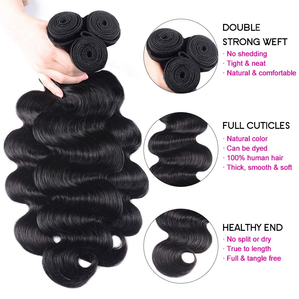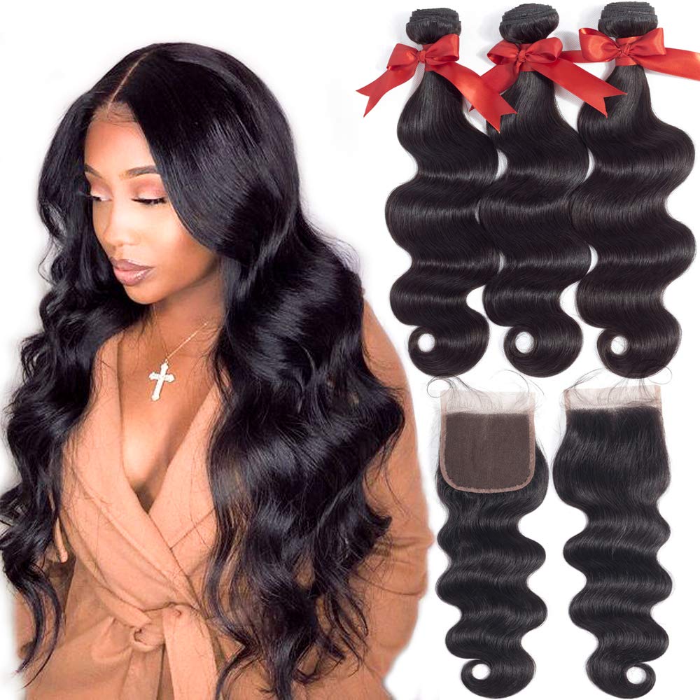 Kbeth Hair Brazilian Human Hair Body Wave 3 Bundles with Closure Unprocessed Brazilian Body Wave Human Hair Double Weft with Lace Closure 4×4 Free Part