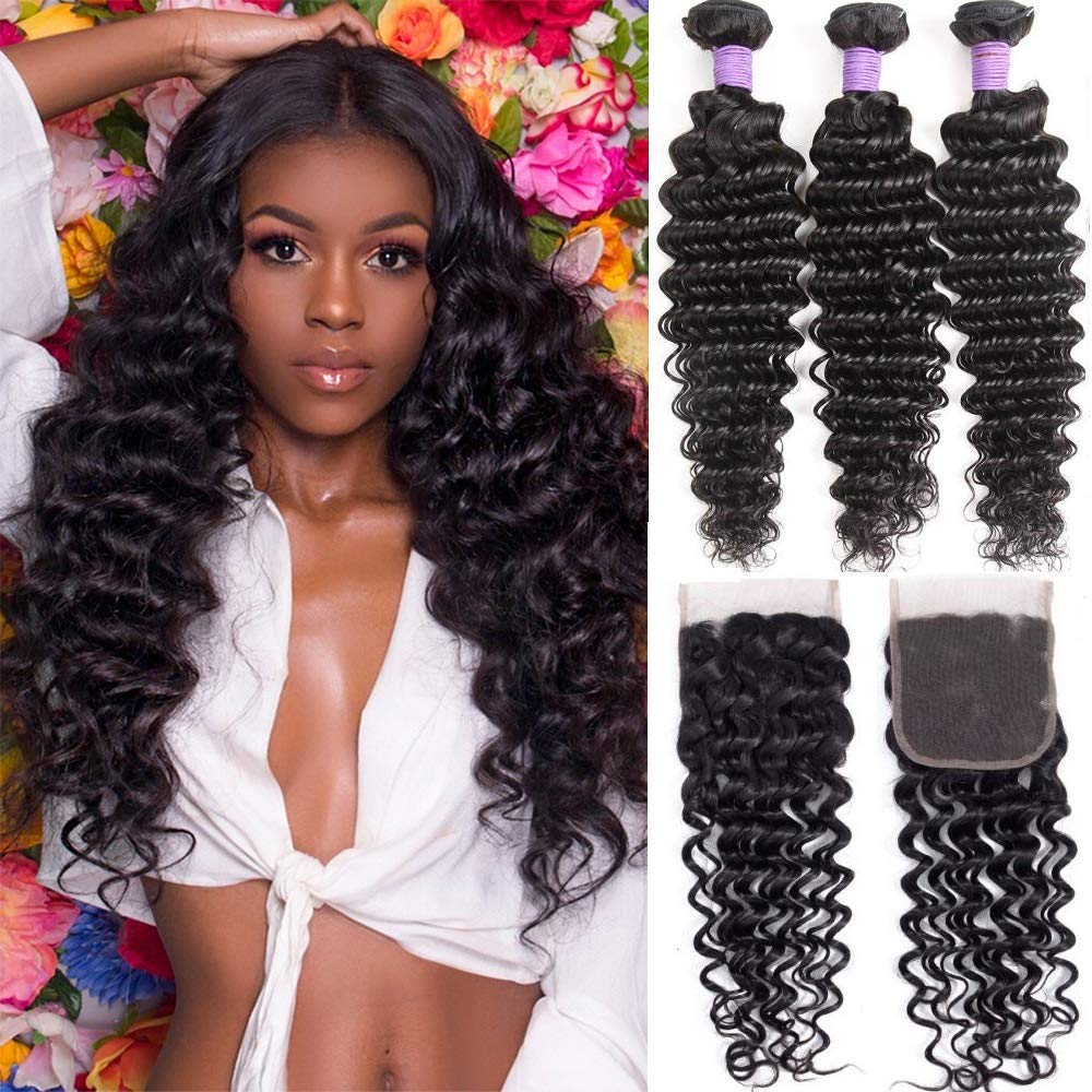 Brazilian Deep Wave Bundles with Closure 10A Virgin Human Hair Bundles with Closure Wet and Wavy Curly Hair Weave 3 Bundles with Lace Closure Free Part